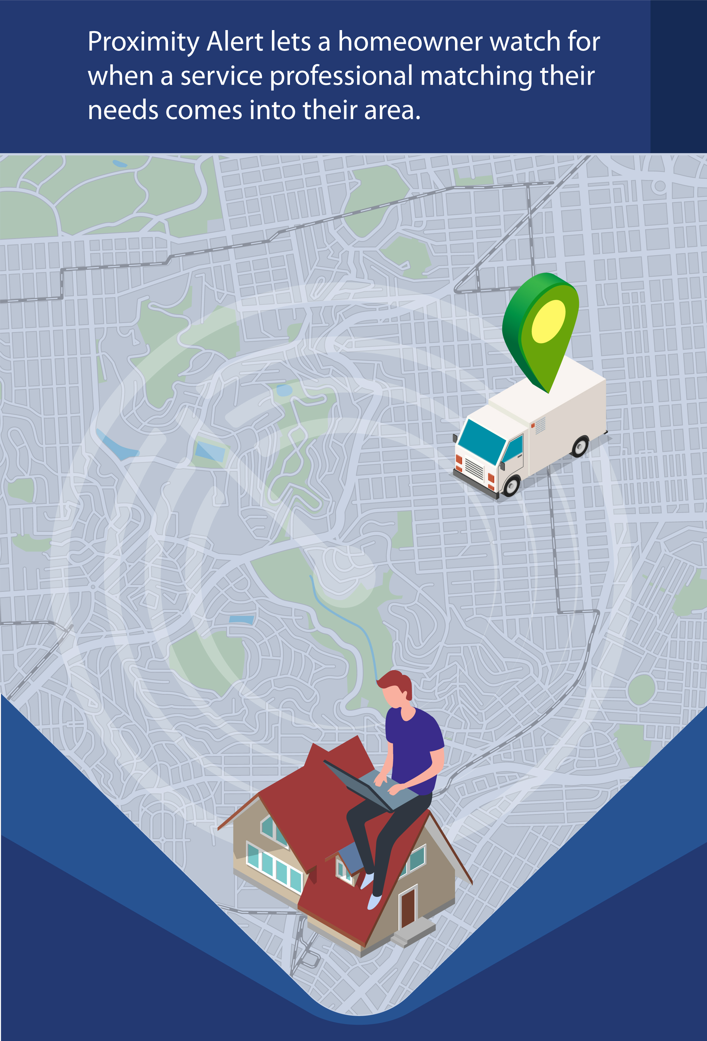 Lets the homeowner get notified when there is a service professional nearby that they are looking for. If a homeowner is looking for a plumber, for example, Proximity Alert tells them when one is close by.