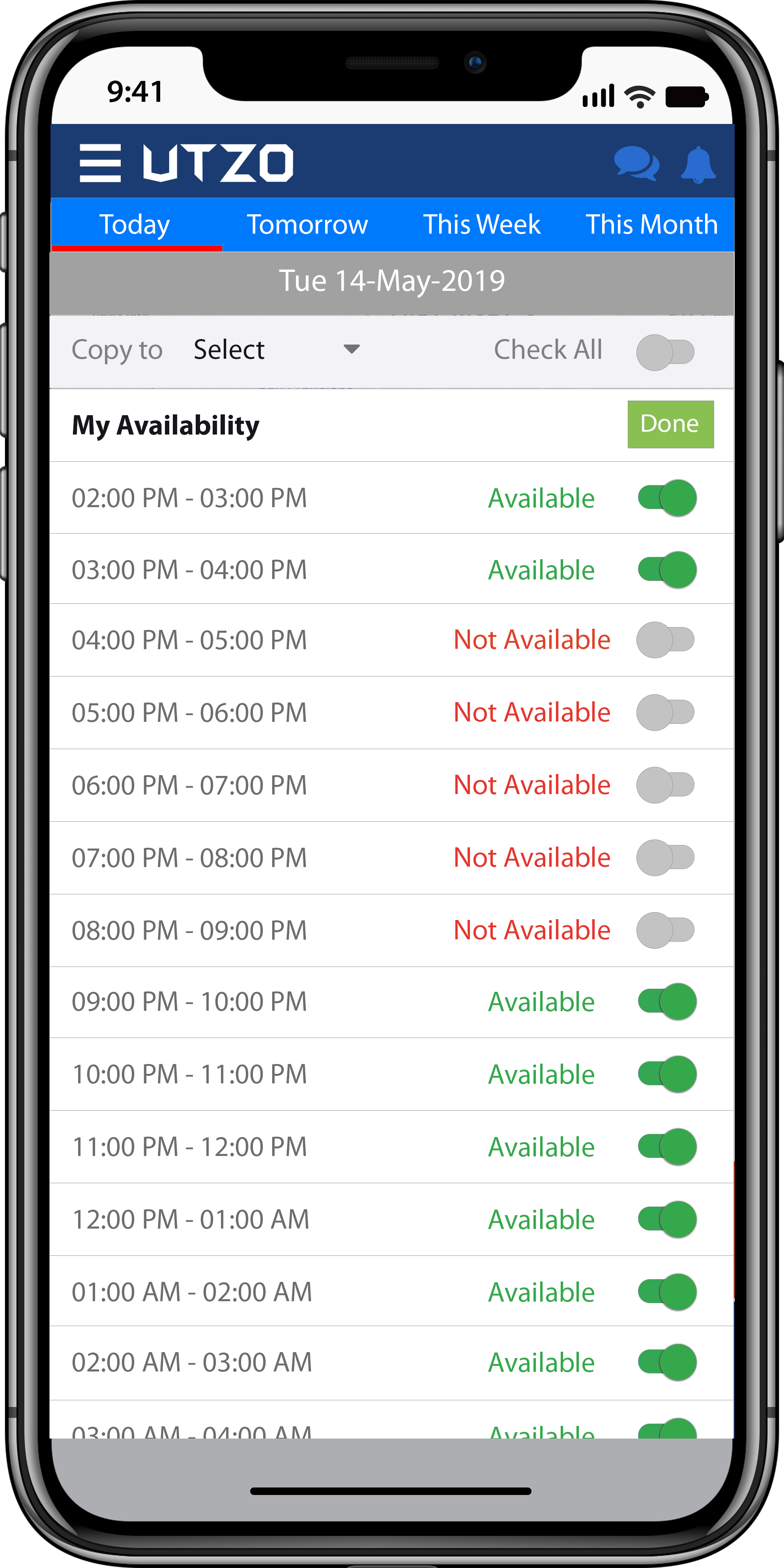 UTZO allows you to set the schedule for your services. You have full control over your service schedule and when you are available. Service hours change? No problem. Use the app or website to update your new service schedule and begin receiving leads based on that new schedule.